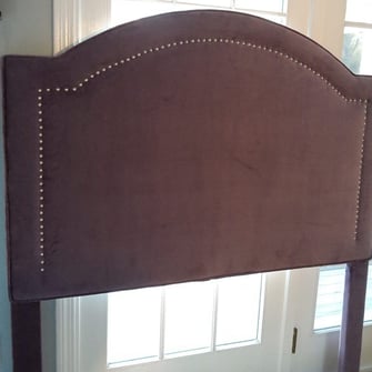 Bespoke headboard designed and crafted by GreenBarn. Purple velvet fabric with polished nickel brad accents.
